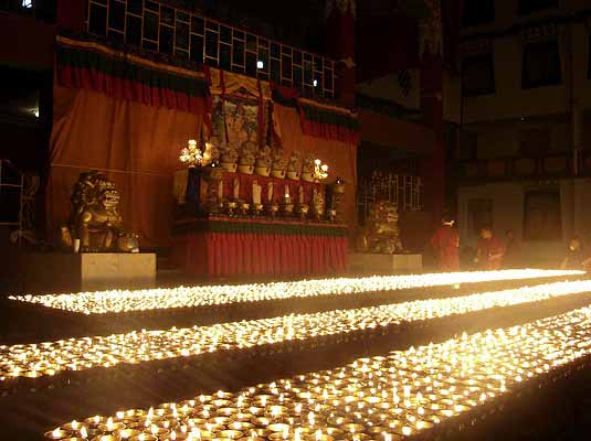 In light of the terrible news of the human tragedy currently taking place in Tibet, the 12th Kenting Tai Situpa immediately asked monks, nuns and the lay Dharma community of Palpung Sherabling Monastic Seat to conduct prayers for everyone affected by the conflict. 'Every person and every sentient being wishes to be happy and no one wishes to suffer. The only purpose of the teachings of Lord Buddha is to fulfill this wish. Therefore it is our duty as followers of Buddha to pray and seek the blessing of the Buddha for the same. I want all of you to pray very sincerely for those who have lost their lives and who are injured, as well as those who are suffering in Tibet. Because this is happening right now, I also want you to include all the other human beings and all mother sentient beings elsewhere in this world and beyond.' Ongoing prayers include one hundred thousand Tara prayers (Mother of Compassion) and a special gathering for Monlam prayer (sacred supplication of great Boddhisatvas). An additional offering of ten thousand Butter Lamps was conducted in the main court yard of the main monastic complex on the evening of March 19th 2008.