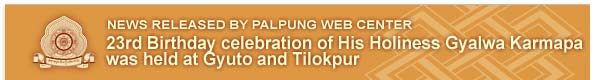 The morning of June 26th at 8:00 a.m., celebrations got underway at Gyuto Monastery where all the necessary arrangements for this elaborate function were taken care of by Gyuto monastery. The Abbot of Gyuto and many other senior Rinpoches and Khenpos, lamas and devotees from various countries joined in the celebration. The 12th Kenting Tai Situpa also participated on this auspicious day. Later that day, in the afternoon, His Holiness Gyalwa Karmapa and Kenting Tai Situpa traveled together to visit the Tilokpur Nunnery of Karma Kagyu Lineage. They were greeted by an elaborate welcome ceremony arranged by the nuns of Tilokpur with the help of some of the monks of Palpung Sherabling. After noon on 2.00.clock the 23rd Birthday Celebration of His Holiness began and the 12th Kenting Tai Situpa made elaborate Manadala offerings to His Holiness Gyalwa Karmapa followed by offerings from the administration of Palpung Sherabling. After that the Tilokpur Nunnery also made a Mandala offering to His Holiness followed by a traditional Tea with saffron rice, which was served to all the monks, nuns and devotees made their offerings. That same afternoon from 3pm to 5pm His Holiness gave a teaching on how the Guru-Disciple relation manifests and how all lineage masters of the past have received the teaching from gurus. From 5:30 onward, a western style birthday celebration was held in the courtyard of Tilokpur Nunnery where His Holiness Gyalwa Karmapa, with Kenting Tai Situpa, sat on a chair and cut the birthday-cake, this was followed by some songs sung by devotees from Taiwan. In the evening an elaborate dinner was served to the Sangha and guests. The day ended as a most joyful and blessed occasion for Tilokpur Nunnery and devotees having delighted in the presence of His Holiness Gyalwa Karmapa and Kenting Tai Situpa for such a momentous occasion.