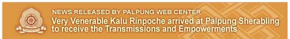 The Very Venerable Yangsid Kalu Rinpoche arrived at Palpung Sherabling Monastic Seat on September 21, 2008 to receive the ongoing Transmissions and Empowerment's of the remaining two Treasuries from Chamgon Kenting Tai Situpa. This is the first visit following the Very Venerable Kalu Rinpoche's recent completion of his Shangpa Three year retreat. The Rinpoches and Sangha of Palpung Sherabling received the Very Venerable Kalu Rinpoche with a traditional welcome. Starting at the main gate of Monastic Seat, the Very Venerable Mingyur Rinpoche, Gangkar Rinpoche, Gyalton Rinpoche, Thutop Rinpoche met the Very Venerable Yangsid Kalu Rinpoche when he arrived. Once in the audience chamber of Chamgom Kenting Tai Situpa, the Very Venerable Kalu Rinpoche was received with a traditional tea ceremony after which all the Lamas, monks, nuns and lay devotes received blessings from the Very Venerable Kalu Rinpoche.