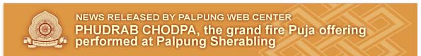 PHUDRAB CHODPA, the grand fire Puja offering is one of the main practices performed at Palpung Sherabling Monastic Seat. This offering to all the Buddhas, Boddhisattvas, Mahasiddhas, Lamas, Yidams, Dharma Protectors, Dakas and Dakinis is made from time to time on special occasions at Palpung Sherabling. While serving as an offering to the holy Sangha, this fire puja also provides a grand gift to all the beings in the lower realms who suffer from various different negative Karmas. The text for this offering was written by the Vajradhara the 12th Kenting Tai Situpa. On October 14th, 2008, this very auspicious full moon day, this grand fire puja was led by His Eminence Jamagon Kongtrul Rinpoche, His Eminence Sangye Nyenpa Rinpoche, His Eminence Kalu Rinpoche. They in turn were joined by all the Rinpoches, Lamas, Monks and Nuns at Palpung Sherabling Monastic Courtyard. The benefit of performing such a grand fire puja is very profound and includes balancing the outer world helping to reduce unexpected disasters and generally creating more harmony within the environment. At the same time it serves to balance the inner world of all living beings helping to reduce unexpected physical and mental diseases. The core benefit of this practice is to bring this world of appearances and the beings within it, to the highest possible level of health. This general well-being then provides the conditions to increase loving kindness and compassion and finally supports the realization of each individual of his or her own perfect awakened nature.