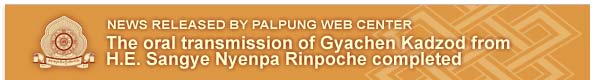 On 21st of October 21, 2008, the oral transmission of Gyachen Kadzod from His Eminence Sangye Nyenpa Rinpoche was auspiciously completed with a grand Mandala Offering made by Palpung Sherabling Monastery and by all the attending Rinpoches. At the same time attendees of this trnasmission received the blessing of His Eminence.