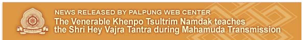 Chamgon Kenting Tai Situpa has asked that the Venerable Khenpo Tsultrim Namdak Rinpoche, the chief Khenpo of Palpung Lungrig Jampal Ling Buddhist Higher Studies at Palpung Sherabling Monastic Seat, teach the Shri Hey Vajra Tantra, written by Jamgon Kongtul Lodro Thaye, to those Sangha currently receiving the three month Mahamuda Transmission and mediation sessions from Chamgon Kenting Tai Situpa at Palpung Sherabling. The Venerable Khenpo Rinpoche will provide one session of teaching on this text each day from September 6th and will continue until the end of the Mahamudra transmission.