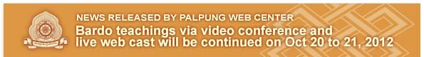 The Bardo teachings requested by disciples around the world were given by the Vajradhara 12 th Chamgon Kenting Tai Situpa via video conference and live web cast from Aug 24 to 26, 2012. Disciples visited Palpung centres around the world to watch the live web cast or join a video conference, where they received the profound and detailed practice instructions from the Vajradhara 12 th Chamgon Kenting Tai Situpa. Due to limited time, the the teachings could not be completed. The remainder of the teachings will be given by Vajradhara Chamgon Kenting Tai Situpa, through video conference and live web cast on Oct 20 to 21, 2012. An English translation is being planned for the live web cast for English participants. For more details please visit Palpung Media Studio website.