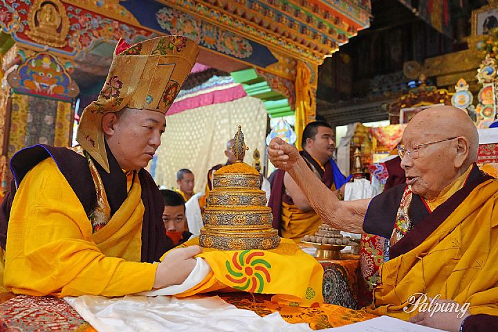 On the morning of March 7, Yongzin Lama Özer Rabgye was escorted to the monastic seat's main temple, where, in the presence of gathered monastics and devoted followers, monks and nuns representing all departments of Palpung Sherabling and Palpung Lhagsam Chöde together offered him a mandala along with the three sacred representations of the Buddha's body, speech, and mind. The ceremony also included a presentation of his life story, followed by an elaborate longevity ritual, during which a complete set of symbolic offerings was presented to him in the traditional sequence.