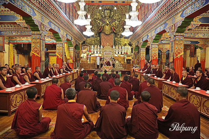On May 4, 2025, the esteemed master scholar Nangyal Ati Sherab Nyima, along with all the teachers, staff, and students of the tantric college gathered in the main temple of Palpung Sherabling Monastic Seat. Following the chanting of auspicious verses and prayers, Nangyal Ati Sherab Nyima presented awards to the students who achieved the best results in the 2024 annual examinations, which covered scriptures, Buddhist sciences, and ritual performance. He concluded the ceremony with a teaching for the entire community.