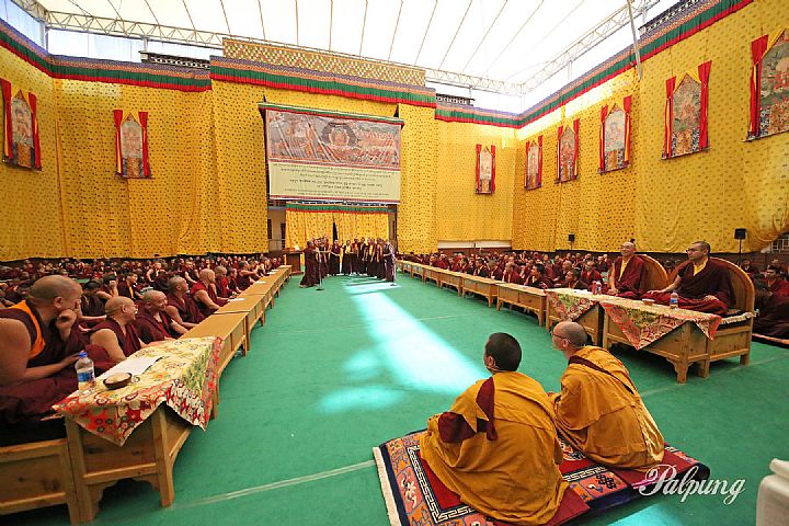 From May 10 to 12, 2025, a three-day ceremony was conducted at Palpung Sherabling Monastic College to mark the Saga Dawa according to the Kalachakra calendar. The auspicious commemoration of our compassionate Teachers's life and activities began with tulkus, khenpos, lamas, and monastic communities from several departments of the monastic seat performing rituals and prayers according to specific traditions of each of the three yanas, followed by Dharma discourses from the point of view of the Theravada, Mahayana, and Vajrayana traditions about the ground, path, and fruition as well as view, meditation, and action; debates on Buddhist scriptures and reasoning; and presentations of common sciences such as grammar, poetics, medicine, and astrology.