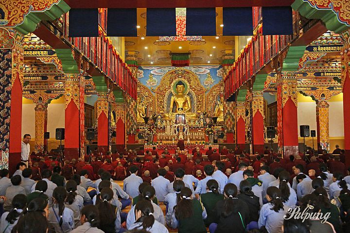 As the culmination of this practice, on July 4, 2025, at the assembly hall of Palpung Sherabling Monastic College, the Head Khenpo presided over a gathering that included the monastic seat's tulkus, lamas, khenpos, teachers, and entire monastic community, along with devoted followers from nearby Tibetan settlements in Bir, Chauntra, and Tashi Jong, as well as students from the Tibetan Children's Village schools in Suja and Chauntra.