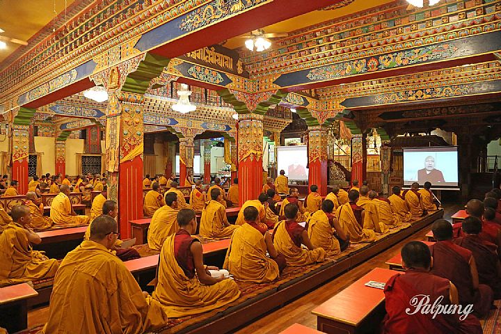 On August 9, 2025, corresponding to the fifteenth day of the sixth Tibetan month, Palpung Sherabling Monastic Seat's entire monastic community gathered in the main shrine hall to commemorate the parinirvana of Lord Gampopa, the sun-like heart disciple of the lord of yogis Milarepa, and to mark the holy day of the miraculous appearance of the Third Karmapa Rangjung Dorje's face in the moon.