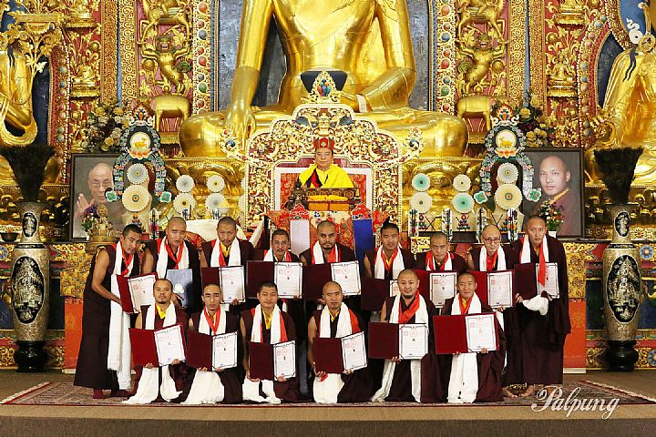 Following that, Guru Vajradhara presented certificates and appointment letters to the new khenpos, acharyas, teaching assistants, and graduates, after which he appointed several new teachers and staff for the Monastic departments and assigned responsibilities to the new graduates. Guru Vajradhara graciously bestowed precious advice and teachings, like molten gold, on the importance of cultivating pure perception and faith in non-sectarian teachings, and on how sincere motivation is the foundation for all collections of temporary and long-term benefits and happiness.