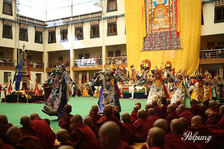 Guru Vajradhara His Holiness Chamgon Kenting Tai Situpa and Jetsün Pema, sister of His Holiness the Dalai Lama, graced the sacred dances with their presence. On the 15th, the preliminary Gutor Mahakala vajra dances that bring liberation upon seeing were performed without masks.