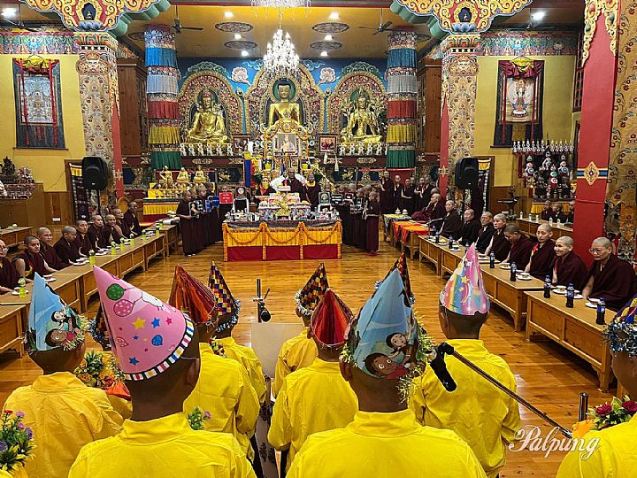 The monastic community began the festivities with a smoke offering ritual, followed by a mandala, together with representations of the Buddha's body, speech, and mind was offered to his throne, accompanied by the recitation of auspicious verses. Traditional ceremonial tea and sweet rice were then served to the entire assembly of resident and visiting monastics and lay devotees.