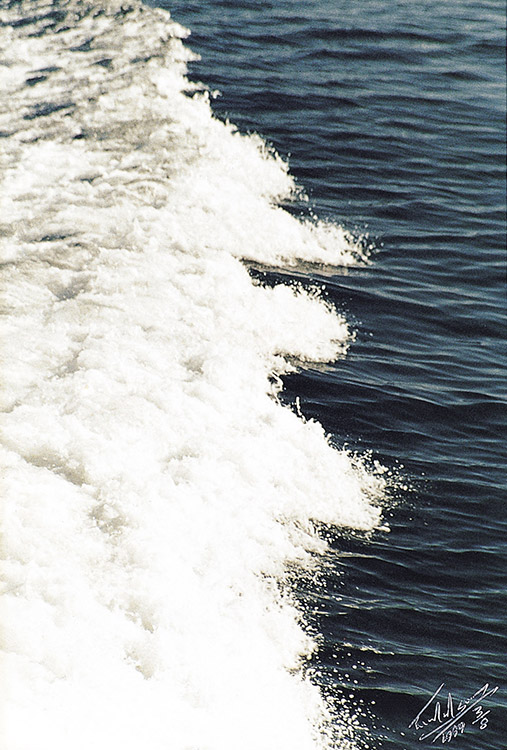 從溫哥華前往維多利亞授課途中所拍攝。我在船上,我從舺板上拍攝,照的是波浪,白色的部份是船所造成的,時為日中。