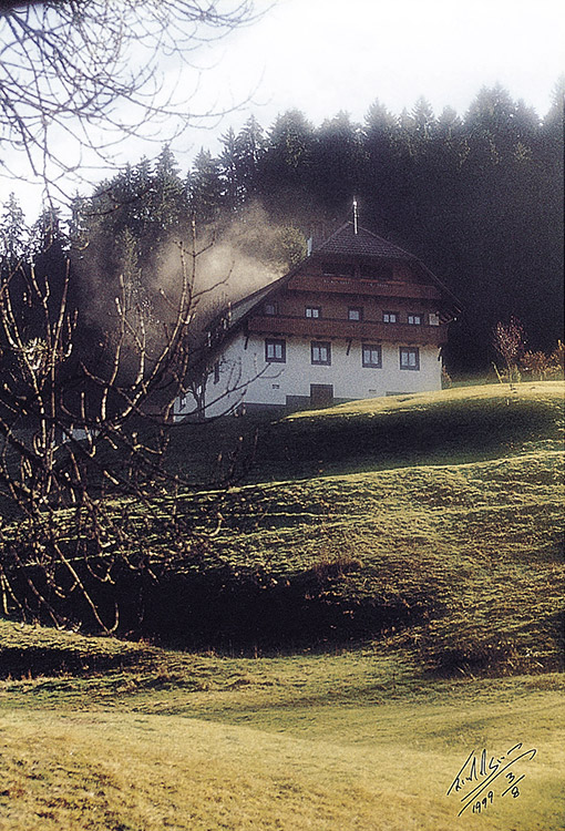 黑森林,我在那裡教書。我從住處的窗戶所拍攝。大清早,大地、樹林、升火的人們、草地上的朝陽互相映照。