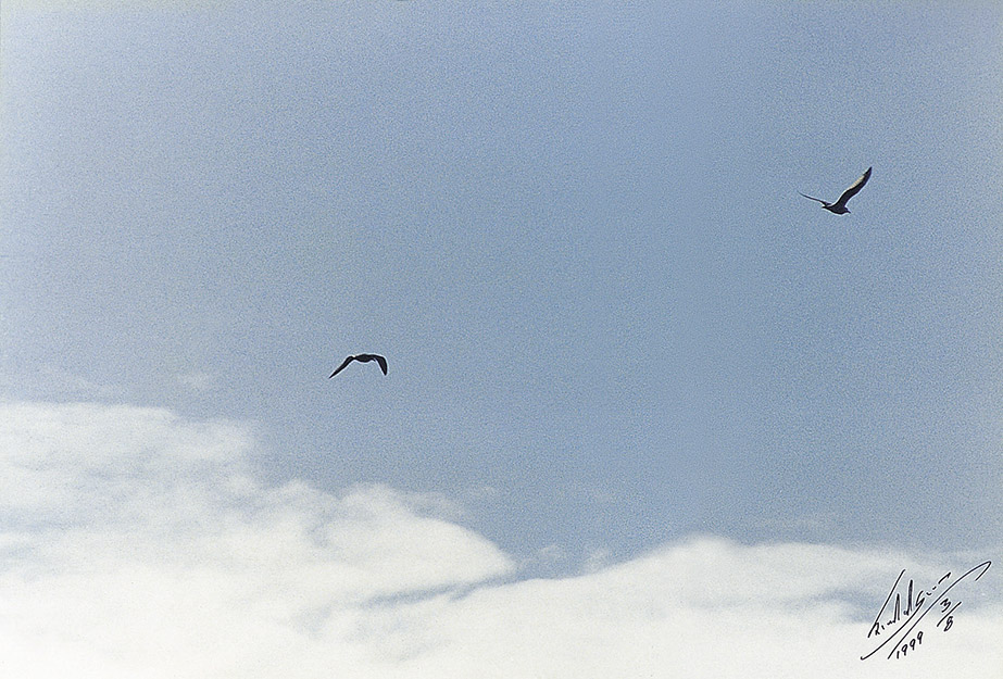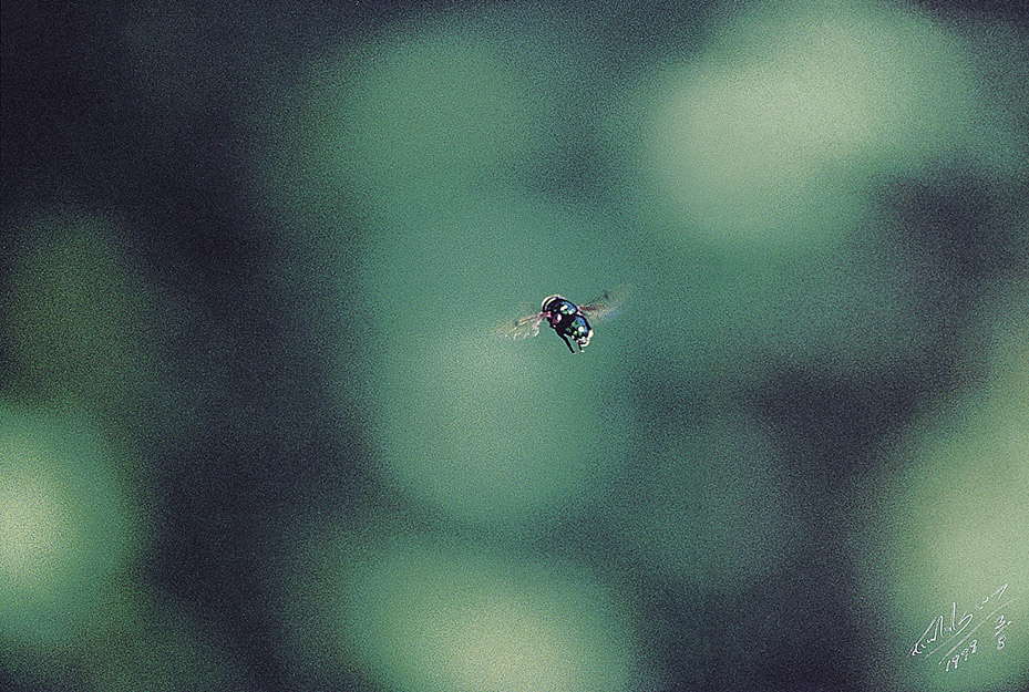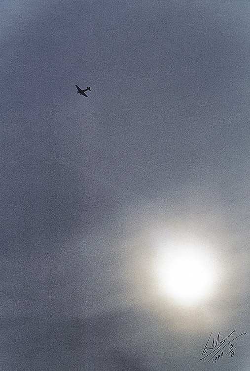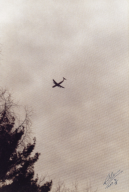 從窗戶所拍攝。窗戶有一層防蚊蟲的網。飛機要降落在我不知道的機場。我覺得有趣,飛機在飛,但看似在紗窗裡。所以我稱之為自由的囚犯。人人為自由瘋狂,成了自由的囚犯。我的意思不是從自由來的囚犯,而是自由的囚犯。如果你執迷於任何事物,就會變成它的囚犯。我是在兩堂課之間,從我的臥室窗戶拍攝的。