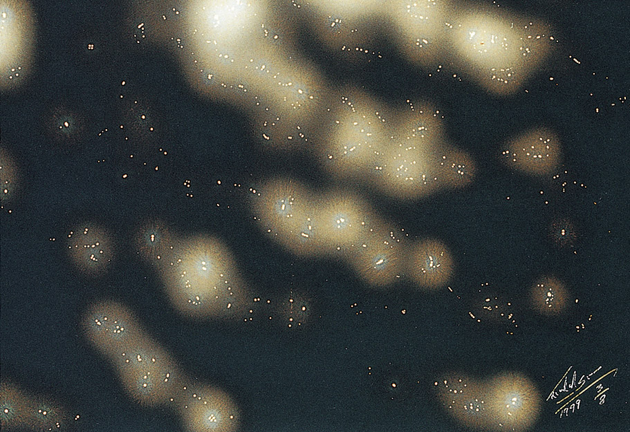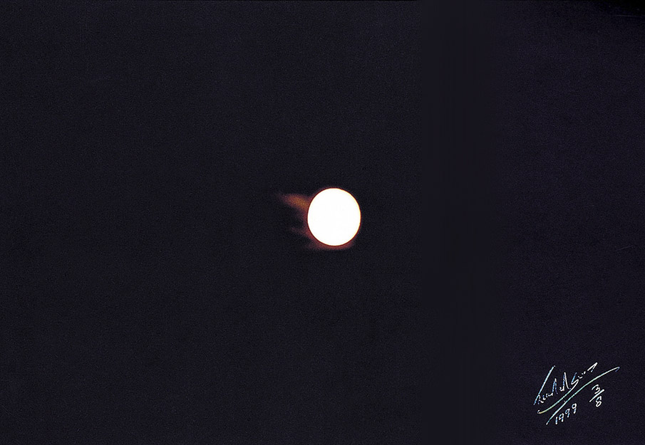 這張是夜晚拍攝的。這個黑底很好,太陽月亮都有了背景,而月亮比太陽有更多的光。我知道背景是黑的,但我不知道會有一個小尾巴。我想那並非真的是太陽的光焰,我不覺得。可能是雲。而環繞著月亮的這個,我把它弄模糊,顯出月亮的光。
