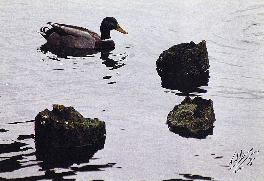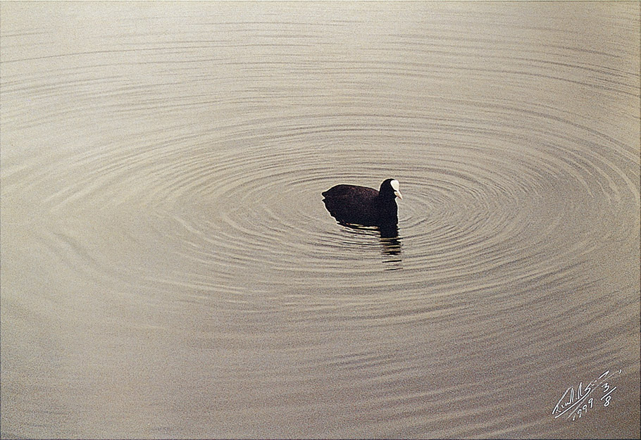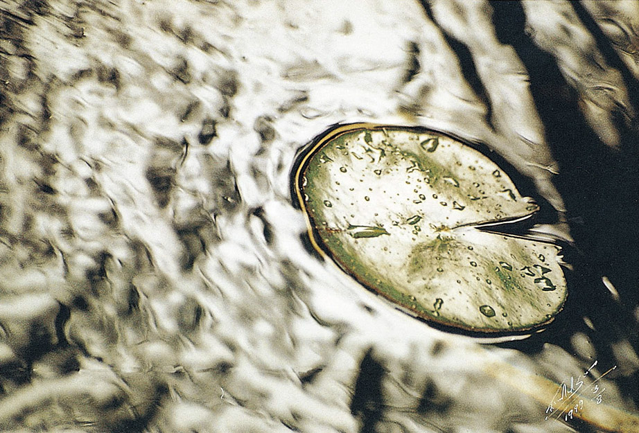 水上的荷葉,非常簡單。但是我喜歡它表現水與葉子及其紋路的樣子。非常神聖。完美的像是書法。不像照片。水不像是一般的水,好神奇。這張照片是一個很特別的顯示,在移動時我拍下了,我覺得它有著某種東西是有趣的,但照出來比我想的更好。好很多倍。相機看不到這個,不是這樣的。那是某個有趣的時刻。水因風吹而動,由風吹向風,我想。