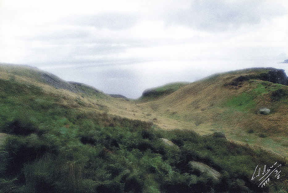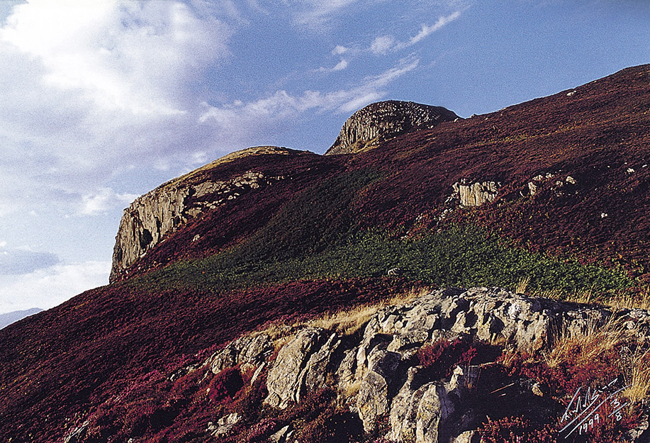 這是張美麗而且真實的照片。全部,包括天空、山與岩石。曾經出現,就永遠存在。那些岩石懸崖真是神奇,好巨大。全部是石南花的紅色,蘇格蘭石南。極佳的取景,兩個懸崖,兩個頭。非常神奇,朝向 Arran。