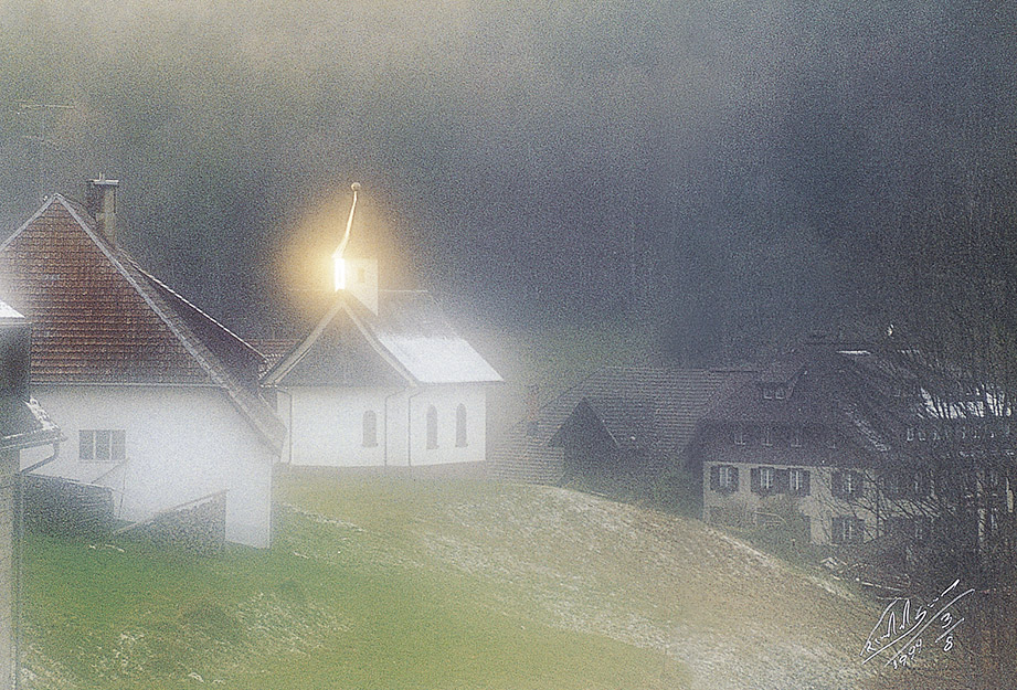 在黑森林,也是從我所住的旅館的窗戶拍攝的。但另外一張是從別個方向,這張是從這個方向。我想是在下午拍的。被光碰觸,那是陽光照耀在屋頂。我想是晚上,太陽來自另一個方向。被光碰觸,應該就像這樣。千百人中,也許有一個被碰觸了,有些像是這樣。