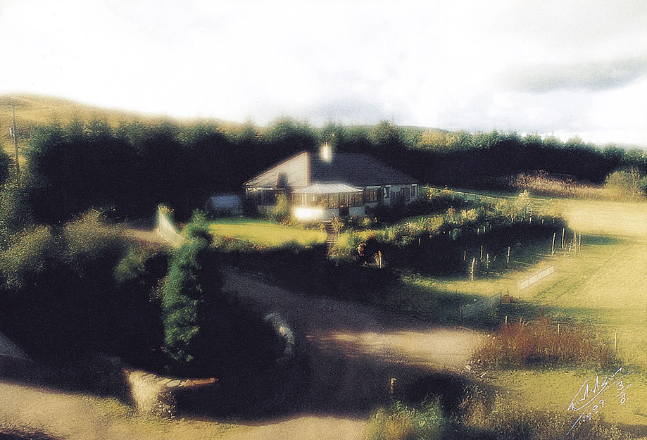從 Samye Ling 的屋頂所拍攝的。我正在露台散步看到了。一個信徒的家。光影、綠意、樹、天空,一切都極佳。 我故意弄模糊。並非焦距不對,如果仔細看,細節都在,很完美的。