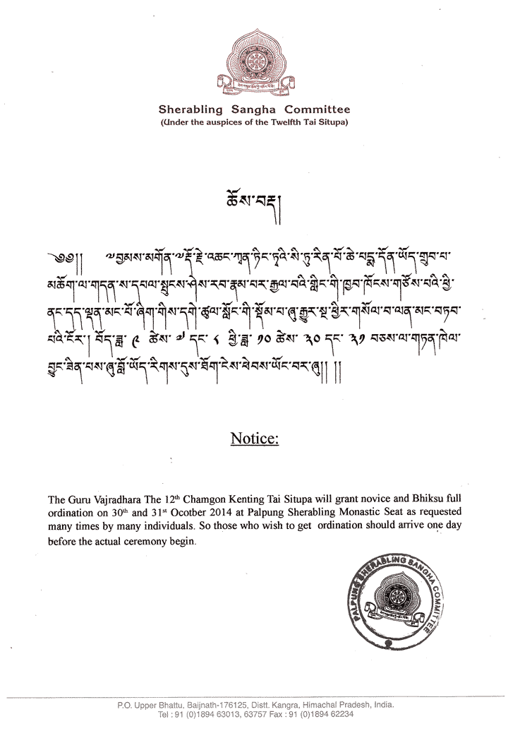 The ordinations are for monks or nuns only. Details please contact: Lama Paljor email: paljortsering@gmail.com, and please set email subject as "Ordination".