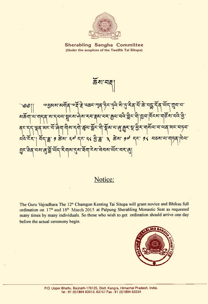 The ordinations are for monks or nuns only. Details please contact: Lama Paljor email: paljortsering@gmail.com, and please set email subject as "Ordination".