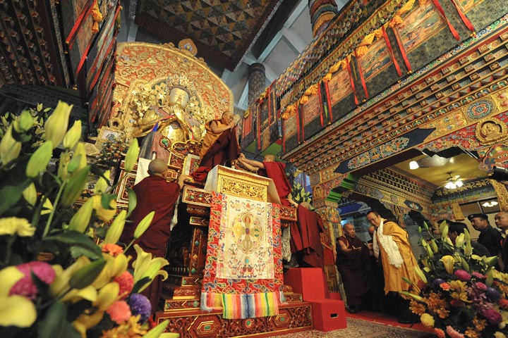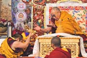 His Holiness consecrated the main shrine hall, library on the floor above the assembly hall and above it the hall of 15 three dimensional mandalas where His Holiness recited verses of consecration and scattered blessed rice and flowers.