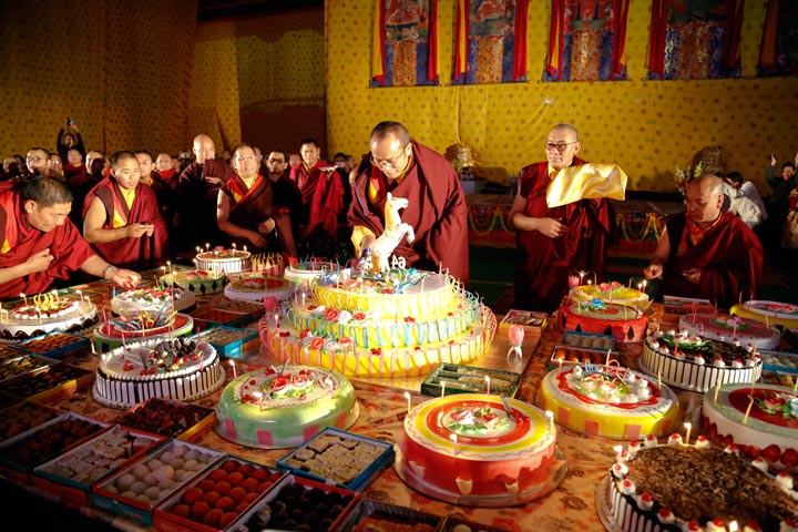 At 7 pm, the programme continued in the monastery courtyard with birthday cakes and sweets forming part of a contemporary birthday celebration, along with offerings of birthday wishes, as well as traditional songs and dances.