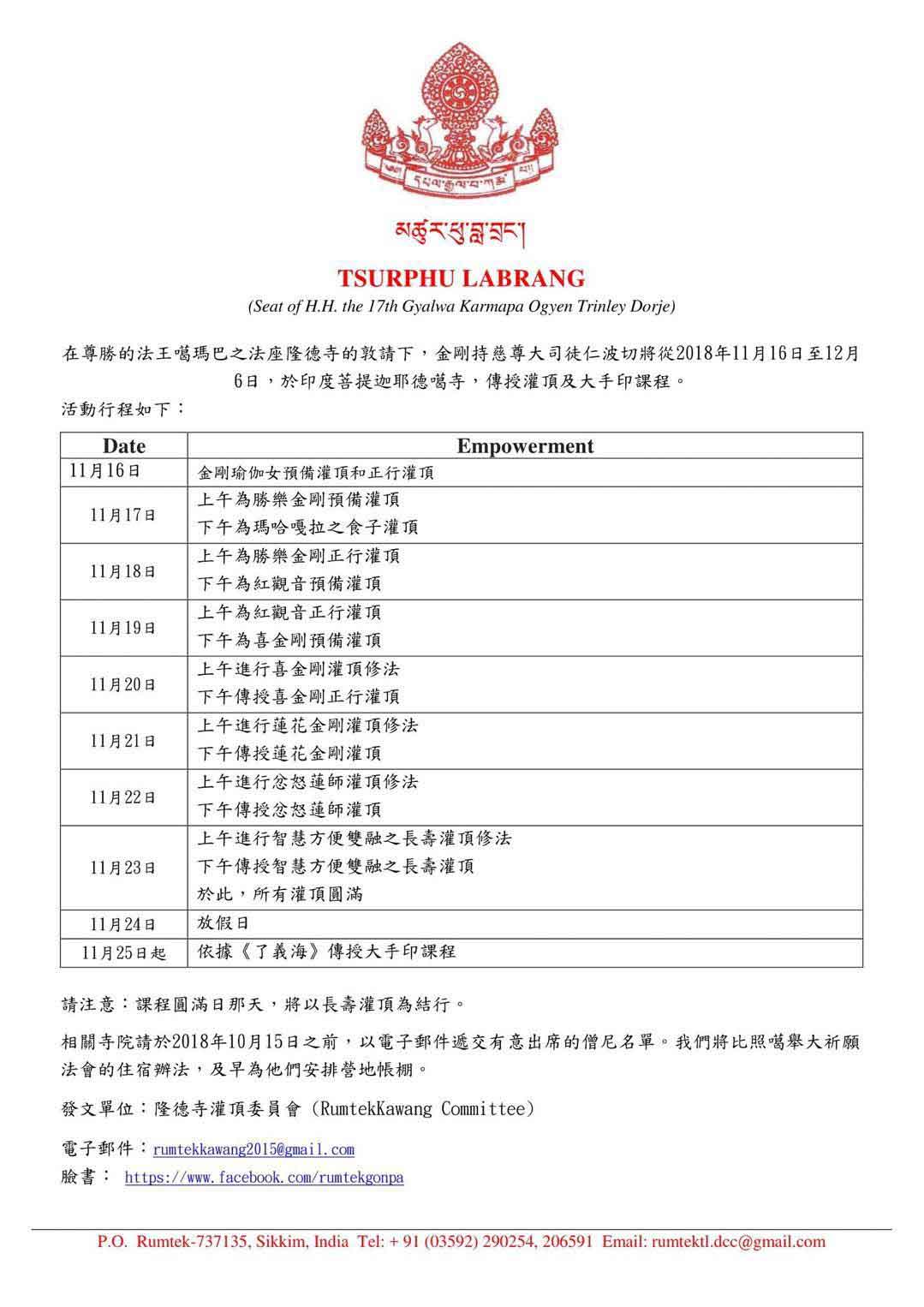 請注意: 這項灌頂及傳授的請法和主辦單位為隆德寺, 相關訊息及細節請連絡主辦單位, 連絡方式請詳文件內資料。