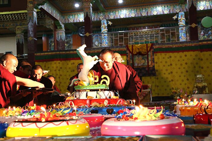 晚上7點,金剛持慈尊廣定大司徒巴在僧眾的陪同下來到寺院中庭,參加現代式的生日慶祝活動。活動現場有生日蛋糕、甜點以及大眾獻上的生日祝福。八蚌智慧林小學的學生們表演了傳統與現代歌舞。就此,由八蚌智慧林法座組織,并由從前的出家眾協助的金剛持廣定大司徒巴生日慶典,在歡快的氣氛中圓滿落幕。
