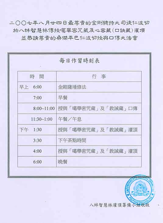 五巨寶藏之噶舉密藏及心密藏法會期間作息時間表