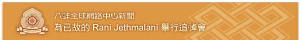 Rani Jethmalani 是印度著名的最高法院的律師,也是印度前聯邦法務部長的女兒,因為久病,於2011年12月31日早上在孟買往生。許多她親近的朋友在2012年1月21日於德里的 Sri Aurobindo Ashram,為她安排了追悼會,許多偉大的上師也參加了這項活動。慈尊廣定大司徒巴和一些喇嘛也參加了這項追悼會,同時修誦祈願文回向給她。Rani Jethmalani 長久以來一直非常虔敬和支持慈尊廣定大司徒巴的各項活動。 慈尊廣定大司徒巴在追悼會中提到:Rani Jethmalani 是一位非常仁慈、成熟和虔敬的人,她的目標是成就神格,我們每一個人都應該把真誠和純淨思維回向給她,讓她成為神格的理想得以實現,死亡的只是身體,我們究竟的本質是不朽的,在本質上,我們永遠再一起。