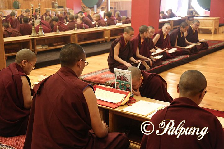 通過八蚌耶喜讓傑林尼寺師生的共同努力,本年度修法儀規的專項課程傳授已圓滿完成。此課程以經典、密續和佛教科學這些科目為基礎。尼寺的課程科目表是上師金剛持慈尊廣定大司徒巴為提升八蚌耶喜讓傑林尼寺的教育水準而設定的。隨後,從 2021 年 5 月 21 日起,在尼寺堪布、工作人員和專項教師的嚴謹監督下,尼寺進行了為期五天的年度修法儀軌考試。考試內容包括背誦日常修法和常規法會的儀軌程式,製作朵瑪和朵瑪飾物及其安置,以及吹奏各種法器,如白海螺、嘉令號、鼓和鈸。
