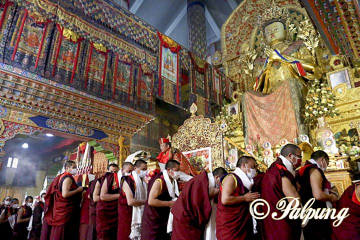儀軌圓滿後,安居在寺院的僧眾和信眾按照傳統的座位安排,按行入座。 隨後,上師金剛持慈尊廣定大司徒巴蒞臨,和大眾一起享用了茶、甜米和其他傳統食物的吉祥喜宴。最後,上師金剛持為參加者們一一賜予了祝福和加持,圓滿了雄水虎年吉祥歡喜的新年慶祝活動。