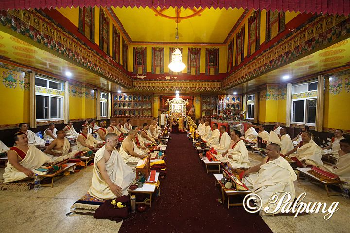 依循往昔上師們的榜樣和上師金剛持慈尊廣定大司徒巴的遠見和指導,今年神變月十四日(2022年3月17日),八蚌智慧林的金剛上師、閉關上師與圓滿了為期三年零三個兩周閉關修行的堪布、祖古和喇嘛們,一起修持了密勒日巴上師瑜伽、祈請三根本廣大事業之儀軌,及那洛六法日修儀軌。晚上,他們頭戴禪修帽,身披白色棉質法衣,唱誦噶舉上師道歌海。早上5點30分,他們則組成身披棉布法衣的遊行佇列,在持香僧眾的護送下,繞行大殿,同時唱誦修行覺受與證悟的道歌,在眾多具緣眾生的心中播下虔信心的種子。