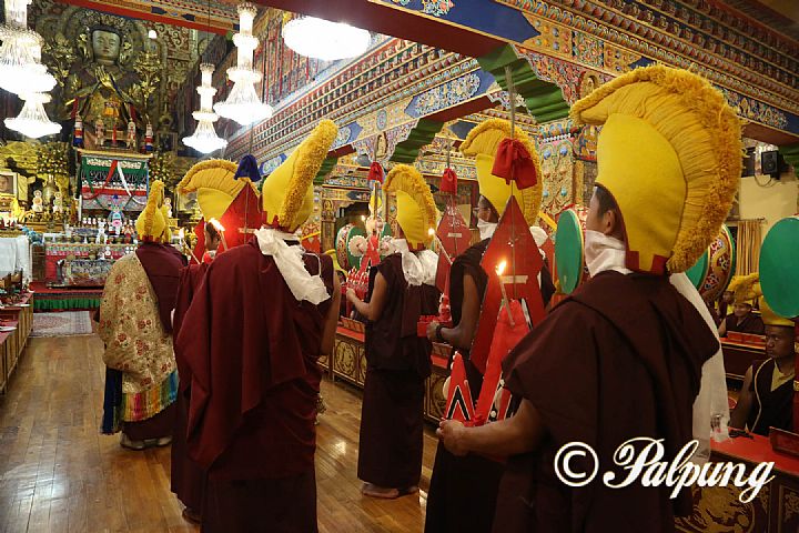 自2022年4月7日,法座的金剛上師在八蚌智慧林密續學院的大殿主持了為期10天的善逝總集八大成就法竹千大法會。寺院的祖古、喇嘛、堪布和所有僧眾通過建起五種圓滿因緣的基礎開始了這一神聖的竹千大法會。在積聚了為護持、成辦、成就所需的一切清淨供品之後,僧眾們開始了這一神聖壇城的生起次第和圓滿次第的修持。這一壇城是一切法乘之巔、一切經教密續的精華,包含一切佛部的所有新舊壇城的至高者。僧眾們依照上師們的口竅結合傳承的儀規傳統來修持這一大成就修法,圓滿其中的所有要素,包括前行的地處開光、設立外內的結界、繪製壇城、莊嚴壇城,正行觀想、禪修、念誦成就法修法,酬補和圓滿四種事業的火供和結行領受悉地及供燈祈願。
