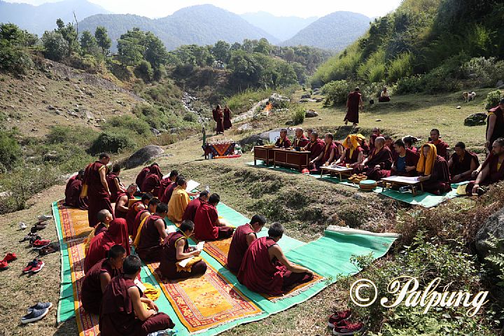 密續學院的全體僧眾,開始了一系列的成就修法法會。首先開啟了喜金剛的壇城,喜金剛是怙主馬爾巴的主要本尊。隨後是如勝樂金剛、大悲勝海紅觀音、金剛亥母和時輪金剛等儀軌的修法。在這一個多月裡, 僧眾們一一修持了這些修法儀軌,同時某些修法部分則在所有修法儀軌裡進行修持。今年基於馬爾巴傳承的密續成就法會,於2022年5月8日在拆解壇城灑沙入河的儀式後圓滿完成。
