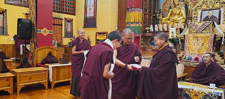 在尼寺的教師、員工和學生們的出席下,有關領導公佈了考試成績,並為在2025年度修法儀軌考試中取得最佳成績的優等生們頒獎。