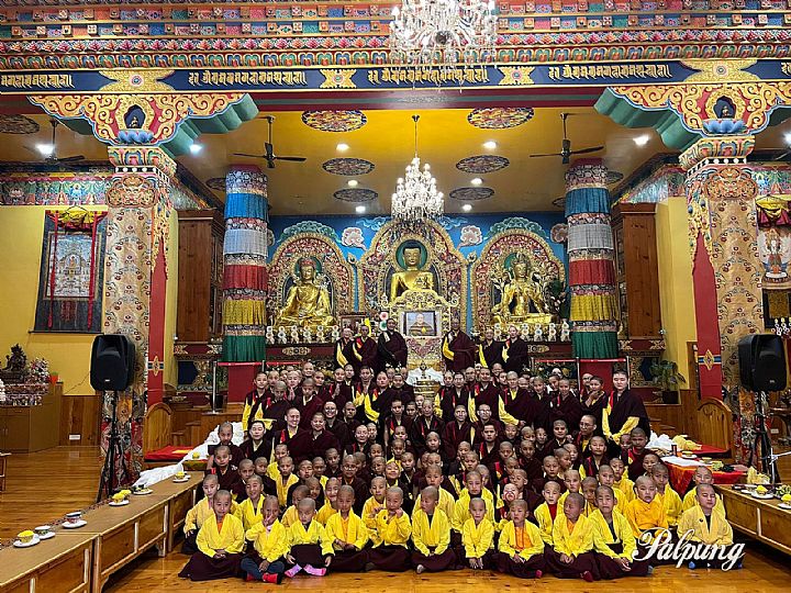 儀軌修法圓滿後,尼寺的教師和全體尼眾向上師金剛持尊勝的慈尊廣定大司徒巴的法像前敬獻哈達。隨後,按照傳統的座位安排,大眾按行入座,一起享用了包括茶、甜米和其他傳統食物組成的吉祥喜宴。