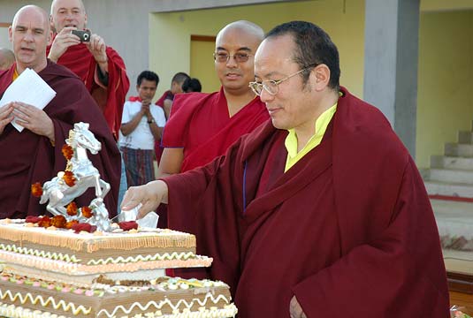 On the afternoon of February 14th 2008, a celebration was held for the 55th birthday of Kenting Tai Situpa Rinpoche. The celebration was arranged by Tergar Monastery and by representatives of every monastery in Bodhgaya. Many Tibetans and foreign students also participated in the day’s events. The first part of the celebration took place in the main shrine hall of Tergar Monastery, where the Very Venerable Mingyur Dorje Rinpoche and the Very Venerable Gangkar Rinpoche made offerings of Body, Speech and Mind. The second part of the celebration was held outdoors and celebrated Tibetan-style with offerings of songs in many different languages as well as a variety of dance performances. At the end of the celebration, the 12th Kenting Tai Situpa taught on Mahamudra in the main shrine of Tergar Monastery and so, the day ended auspiciously and full of blessings in so many ways. Everyone who attended the ceremony was contented with the clear and concise Mahamudra teaching they received from Kenting Tai Situpa Rinpoche.