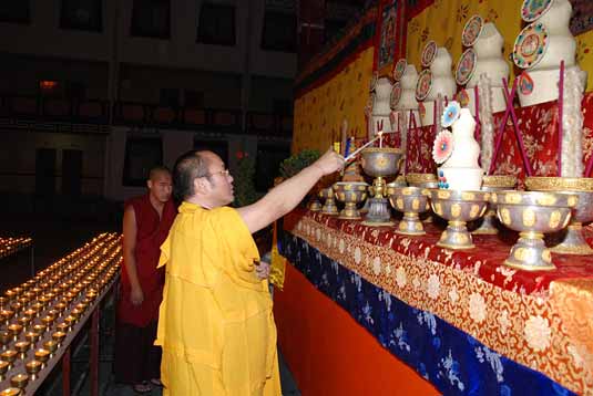 On May 15th, in the main courtyard of Palpung Sherabling Monastic seat, all the sangha gathered headed by Kenting Tai Situpa, to conduct prayers and to offer ten thousand butter lamps. This action is dedicated for the thousands of people who have lost their lives recently as a result of the hurricane in Irrawaddy and other areas of Burma, the Earthquake in Sichuan and other areas of China, the blast in Jaipur, India and as a result of all the natural disasters and conflicts that are currently affecting the lives of millions across the globe. Kenting Tai Situpa sends his blessings and prayers for the affected people and for other forms of life also affected. The natural disasters of this planet are inherently connected with those who live on this world. So it is important that all human beings practice and pray for the betterment of everyone’s lives as well as for the creation of a harmonious environment.