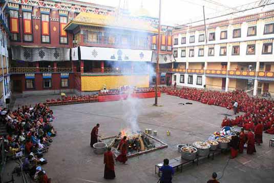PHUDRAB CHODPA, the grand fire Puja offering is one of the main practices performed at Palpung Sherabling Monastic Seat. This offering to all the Buddhas, Boddhisattvas, Mahasiddhas, Lamas, Yidams, Dharma Protectors, Dakas and Dakinis is made from time to time on special occasions at Palpung Sherabling. While serving as an offering to the holy Sangha, this fire puja also provides a grand gift to all the beings in the lower realms who suffer from various different negative Karmas. The text for this offering was written by the Vajradhara the 12th Kenting Tai Situpa. On October 14th, 2008, this very auspicious full moon day, this grand fire puja was led by His Eminence Jamagon Kongtrul Rinpoche, His Eminence Sangye Nyenpa Rinpoche, His Eminence Kalu Rinpoche. They in turn were joined by all the Rinpoches, Lamas, Monks and Nuns at Palpung Sherabling Monastic Courtyard. The benefit of performing such a grand fire puja is very profound and includes balancing the outer world helping to reduce unexpected disasters and generally creating more harmony within the environment. At the same time it serves to balance the inner world of all living beings helping to reduce unexpected physical and mental diseases. The core benefit of this practice is to bring this world of appearances and the beings within it, to the highest possible level of health. This general well-being then provides the conditions to increase loving kindness and compassion and finally supports the realization of each individual of his or her own perfect awakened nature.