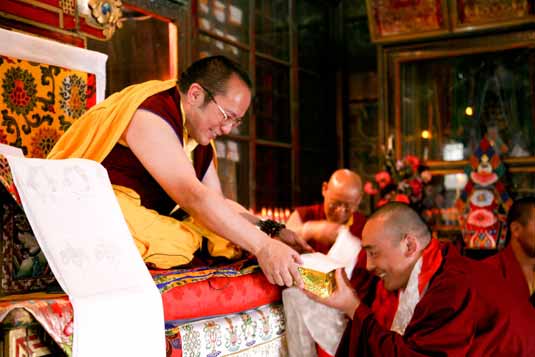 At Ten O’clock on the morning of April 23, 2010 at Palpung Sherabling Monastic Seat’s School of Higher Buddhist Studies, Lungrig Jampal, students received their yearly exam results. During this function, students who stood in first, second and third position in different classes received gifts and blessings from Chamgon Kenting Tai Situpa. Kenting Tai Situpa also provided students and Khenpos with very profound advice about studies and serving the Buddha Dharma with a pure heart for the benefit of all sentient beings.
