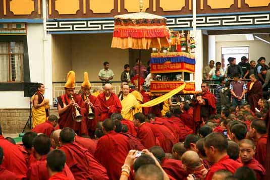 On April 8th, 2011, following the 4th year Mahamudra transmission and after the completion of an 11 day grand Vajrasattva (Dorje Sempa) puja conducted by the Rinpoches and monks of Palpung Sherabling, there was a transmission of the Red Crown Ceremony as well as a Vajrasattva Empowerment given by the Vajradhara Chamgon Kenting Tai Situpa. During the Empowerment Rinpoche presented an enlightened teaching on Vajrasattva for the public. That same night an elaborate Ganachakra and offerings of dances and songs by several young Monastery school monks and some Mahamudra students of were presented as a conclusion and dedication of the Mahamudra transmission from Vajradhara Chamgon Tai Situpa for this year.