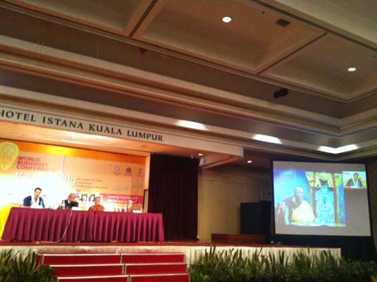 World Buddhist Conference at Kuala Lampur on the theme of "Transcending Negative Emotions", from November 3-4, 2012. The World Buddhist Conference organizers from Malaysia sincerely and with dedication requested Chamgon Dorjechang Kenting Tia Situpa to be the Keynote Speaker on the opening day of the Conference and hold a session on second day on the subject of "Transcending Ordinary Happiness into spiritual well-being", during the two-day World Buddhist Conference at Kuala Lampur, Malaysia from November 3-4, 2012. Due to unforeseen reasons Chamgon Dorjechang Kenting Tia Situpa did not manage to join physically, but during this two-day World Buddhist Conference there was a pre-recorded Keynote Speech on the first day and a live teaching from Chamgon Dorjechang Kenting Tia Situpa took place on the second day via webcast. Everyone who participated in the two-day World Buddhist conference at Kuala Lampur, Malaysia, received these profound teachings and blessings. Originally also teachings and empowerments were arranged at the request of the Vajrayana Buddhist Council of Malaysia from November 5-11, 2012, and most of the programs were cancelled since Chamgon Dorjechang Kenting Tia Situpa was not present. However, Venerable Tsultrim Namdak Rinpoche and Lama Tenam Shastri (Private Secretary to Chamgon Dorjechang Kenting Tia Situpa) and two other monks from Palpung Sherabling participated at the two-day World Buddhist Conference, and most of the programs were carried out by Venerable Khenpo Tsultrim Namdak Rinpoche who represented Chamgon Dorjechang Kenting Tia Situpa for this pre-arranged program. The 27 Vajrayana Buddhist centers who put their efforts toward the visit of Chamgon Dorjechang Kenting Tia Situpa were very sad, but fortunately most of the programs were blessed by Chamgon Dorjechang Kenting Tai Situpa through pre-recorded messages and also by live webcasting during the grand dinner hosted at the One World Hotel and organized by The Kuan Yin Contemplative Order, Kuala Lampur, Malayisa.