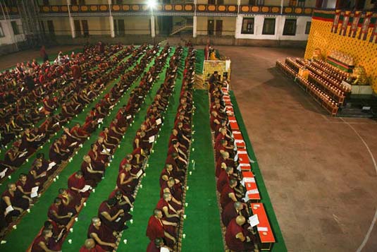 On the evening of 22 June 2013 at the main courtyard of Palpung Sherabling Monastic seat under the blessing of Guru Vajradhara Chamgon Kenting Tai Situpa with all the Sangha, prayers and 10,000 butter lamp offerings were organized and dedicated for the recent victims of the Himalayan flood in India. The prayers and offering of butter lamps are mainly dedicated to the people who lost their lives in this tragedy so that those people may obtain good rebirth, and also for those people who are still trapped in the flooding and landslides so that they may be rescued and safe. Finally, sincere dedication is made so that any kind of natural or man-made disaster of any kind in any part of the world may never be repeated again and that the balance of the elements is maintained. May all living beings have the right intention and action to benefit all living beings and the global environment.