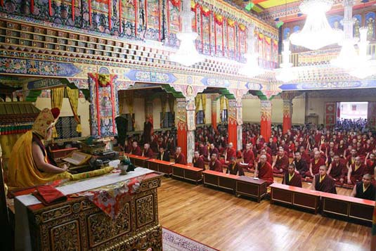 From 1-2 July 2013 for two days there was a grand Empowerment of the Hevajra Yidam given by Guru Vajradhara Chamgon Kenting Tai Situpa at the request of Venerable Tana Tulku Rinpoche for the Sangha of Palpung Sherabling Monastic Seat and devotees. Many devotees from the Bir Tibetan Colony and foreign students who live in Dharamsala participated in this most precious empowerment.