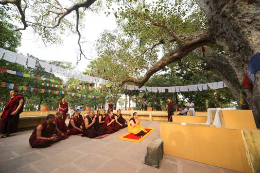 In the afternoon of 13 March 2014, Guru Vajradhara Chamgon Kenting Tai Situpa visited the Maitreya Project in Bodhgaya at the request of Project Director of Maitreya Project Bodhgaya. Guru Vajradhara and an assembly of sangha including many tulkus, khenpos and lamas were warmly welcomed by Lama Zopa Rinpoche and the staff at the Maitreya Project. A short puja was conducted in the shrine room followed by blessing and purification prayers in front of the 24 feet statue of Maitreya Buddha. In the same afternoon, Guru Vajradhara visited Dharmaranya, the holy site where Prince Siddhartha spent six years living as an ascetic before leaving this lifestyle to meditate under the Bodhi tree where he awoke to enlightenment. Guru Vajradhara conducted prayers with his retinue of sangha members at this holy place. Before returning to Tergar monastery, Guru Vajradhara visited the Kagyu Monlam Pavilion where he walked onto the main stage and offered a khata to the Buddha Shakyamuni statue there.