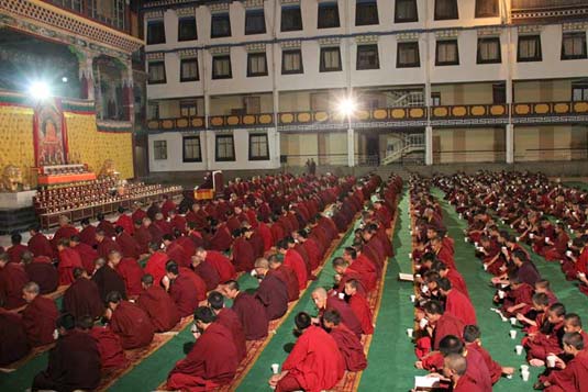 On the evening of the 17th of May 2014, all the Tulkus, Khenpos, Lamas and sangha of Palpung Sherabling Monastic Seat gathered in the main courtyard where Guru Vajradhara Chamgon Kenting Tai Situpa conducted prayers for the late H. E. Tsona Gontse Rinpoche. The five prayers of aspiration were performed and butter lamps lit for His Eminence the 13th Kyabje Tsona Gontse Rinpoche who passed away last night in New Dehli.