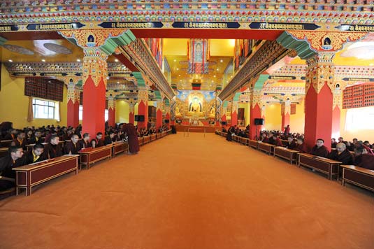 On the 21st of February 2015 an event was conducted to mark the auspicious completion of the newly built Palpung Sherabling Shedra Lungrig Jampal Ling (Monastic University of Higher Buddhist Studies) under the blessing of Guru Vajradhara Chamgon Kenting Tai Situpa. Early in the morning Shedra monks conducted prayers and then Guru Vajradhara arrived in the shrine hall and gave an elaborate teaching and advice to all the monks, nuns and lay devotees. In the afternoon, the monks and nuns of Palpung Shedra demonstrated debating and held discussions on various subjects concerning Buddhist philosophy. At the end of the day, Guru Vajradhara asked the monks and nuns to do dedication prayers for the merit of the Sponsor because it was her pure devotion to Guru Vajradhara and merit that made possible the magnificent facilities at the Shedra for the lineage of the Buddha dharma.