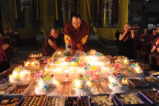 The 8th day of the first month of the female wood sheep year of the Tibetan lunar calendar which corresponds to the 26th of February 2015 was Guru Vajradhara Chamgon Kenting Tai Situpa's 62nd birthday. Early in the morning, all the Sangha gathered in the main shrine hall of Palpung Sherabling Monastic Seat to conduct long life prayers followed by the traditional tea ceremony. Guru Vajradhara advised the administration of the monastery that it is not necessary to hold elaborate birthday celebrations every year and so the arrangement was simple. In the evening, Guru Vajradhara kindly joined dinner with all members of Sangha and guests and there was a cake cutting ceremony. In the end, the school monks of Palpung Sherabling Monastic School performed a culture show with their pure heart as an offering on the ocassion of Guru Vajradhara's 62nd birthday.